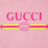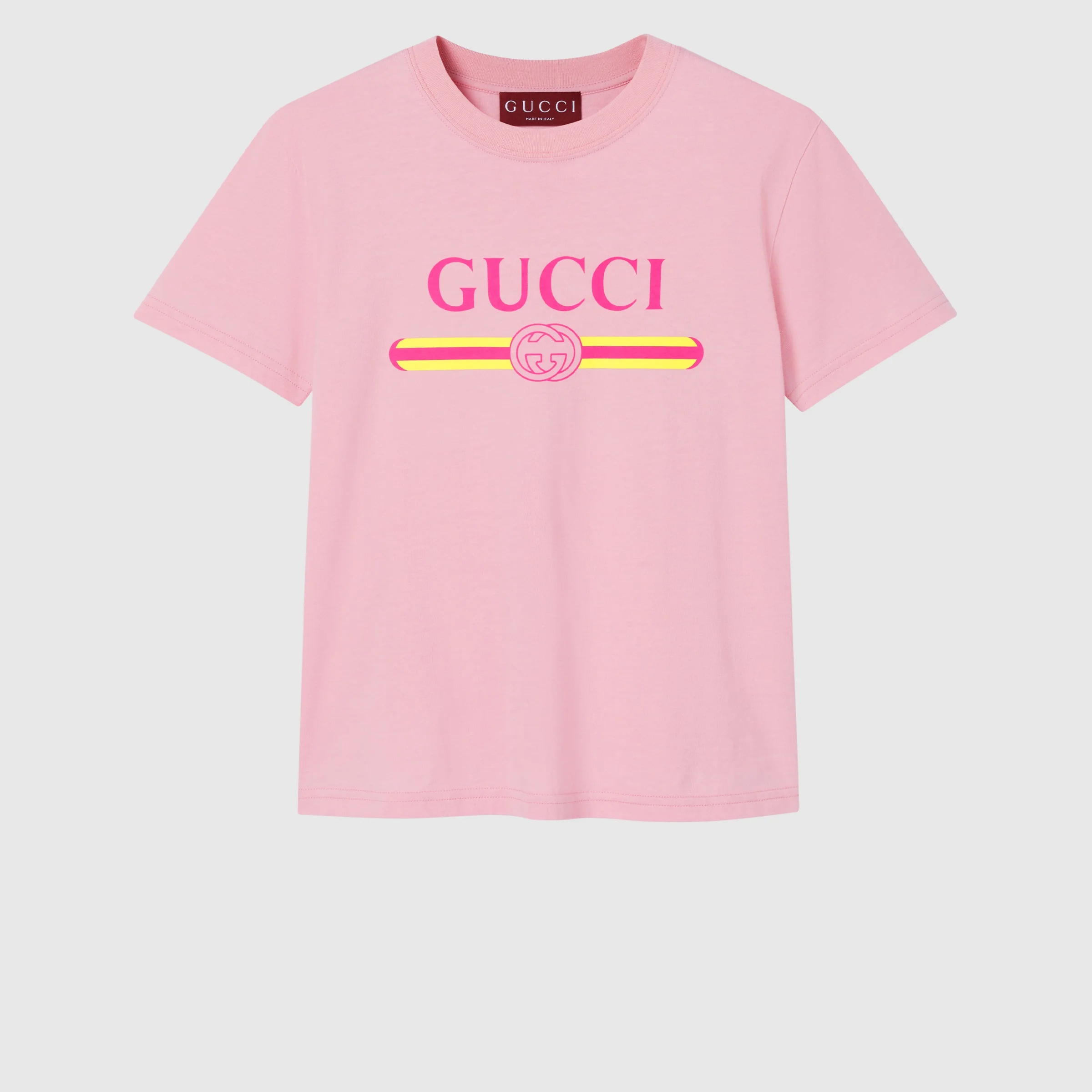For the Pre-fall 2025 collection, everyday pieces are elevated with prints or embroideries for a casual feel. This T-shirt features a Gucci Interlocking G and Web print on the front. - Pink light cotton jersey - Gucci Interlocking G and Web print - Crewneck - Short sleeves - Made in Italy