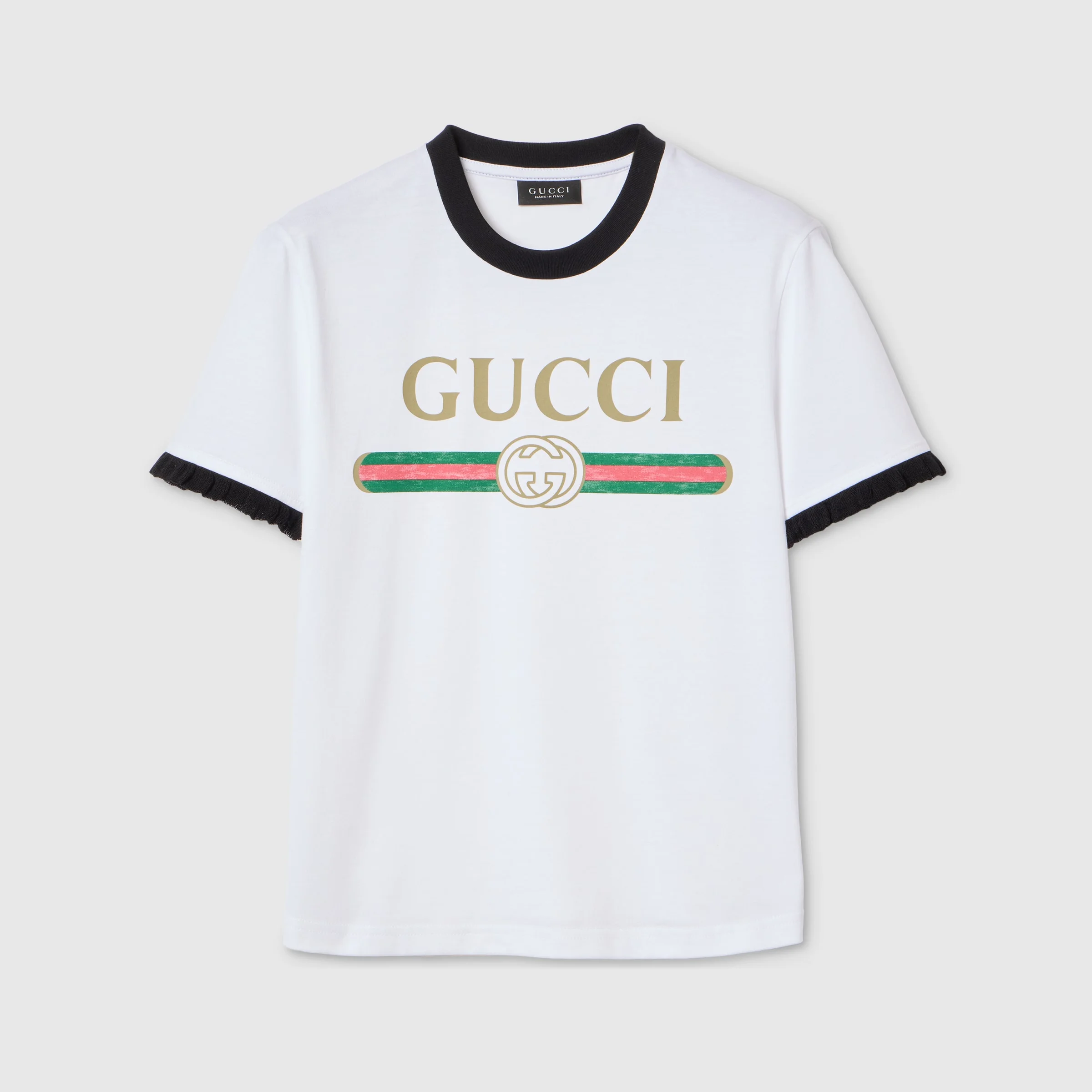 Introducing Spring Summer 2026. This style is part of the La Famiglia collection, which reinterprets the House’s codes through singular personalities and distinctive aesthetic attitudes. Crafted from cotton jersey, this T-shirt is enriched with a Gucci Web with Interlocking G print. - White cotton jersey - Gucci Web with Interlocking G print - Crewneck - Short sleeves with ruffle detail - Length: 20.9", based on a size S - Made in Italy - Fabric: 100% Cotton - Details: 97% Cotton, 2% Polyamide, 1% Elastane