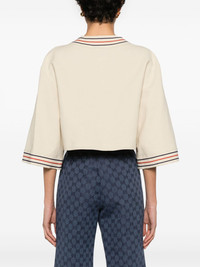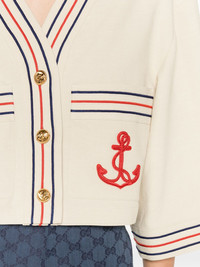 Anchor-applique cropped cardigan With a distinctive logo feel this Gucci shirt returns to the realm of sports and leisure. It features an anchor embroidered patch and Interlocking G anchor gold-toned buttons that draw the silhouette together. Highlights - Beige/navy blue/red - Cotton-linen blend - Logo-embossed buttons - Gold-tone buttons - Anchor print - Striped edge - V-neck - Front button fastening - Drop shoulder - Three-quarter length sleeves - Two front patch pockets - Cropped - Straight hem Made in Italy Composition Viscose 100%, Cotton 61%, Linen/Flax 39% SIZE & FIT Model measurements Height 5 ft 9 in(1.76 m) Bust/Chest 31.88 in(81 cm) Hips 35.43 in(90 cm) Waist 24.8 in(63 cm) FittingInformation Designed for a boxy fit, intended for a loose fit throughout Cropped in length Made with a midweight knit, this piece offers some stretch This piece fits true to size – take your usual size Washing instructions Dry Clean Only