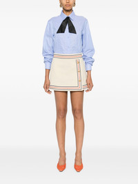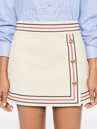 striped-border mini skirt Highlights - Cream white/red/navy blue - Cotton - Striped border - Overlapping panel - A-line - Two side inset pockets - Thigh-length - Straight hem - Unlined - Embossed gold-tone buttons - Front button fastening - Concealed side hook and zip fastening Made in Italy Composition Outer: Cotton 61%, Linen/Flax 39% Lining: Acetate 75%, Silk 25% SIZE & FIT Model measurements Height 5 ft 10 in(1.78 m) Bust/Chest 33.07 in(84 cm) Hips 36.61 in(93 cm) Waist 24.8 in(63 cm) FittingInformation This mini-length skirt is intended to be worn just below the waist Made from a midweight non-stretch fabric This piece fits true to size – take your usual size Washing instructions Dry Clean Only