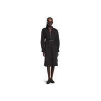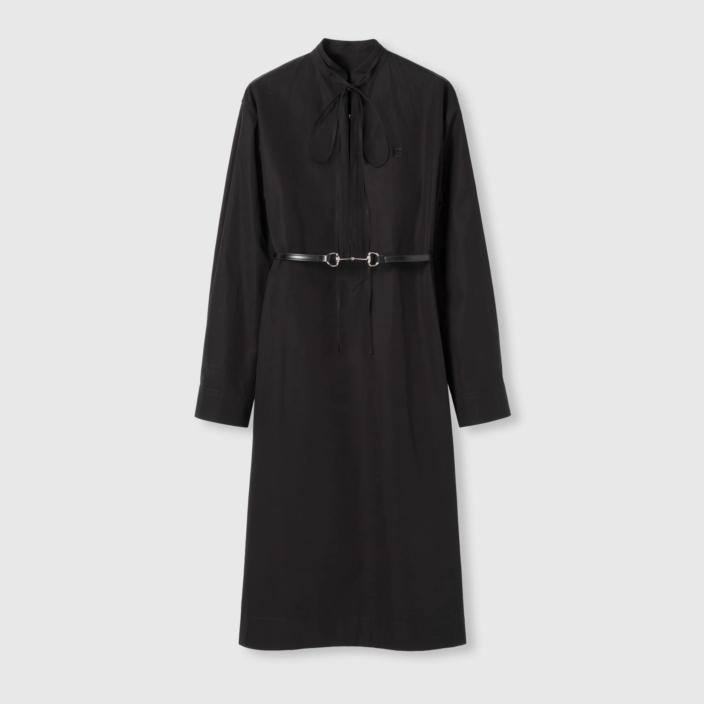 A monochrome palette with subtle details, such as embroideries or logo hardware, transitions the wardrobe from day to night in a selection of pieces from the Pre-Fall 2025 collection. This cotton poplin dress features a detachable leather belt with the Horsebit hardware, while the neckline is complete with a button and loop closure. - Black heavy cotton poplin - Unlined - Stand collar - Self-tie ribbon - Long sleeves - Detachable leather belt with Horsebit buckle - Button and loop closure - Made in Italy