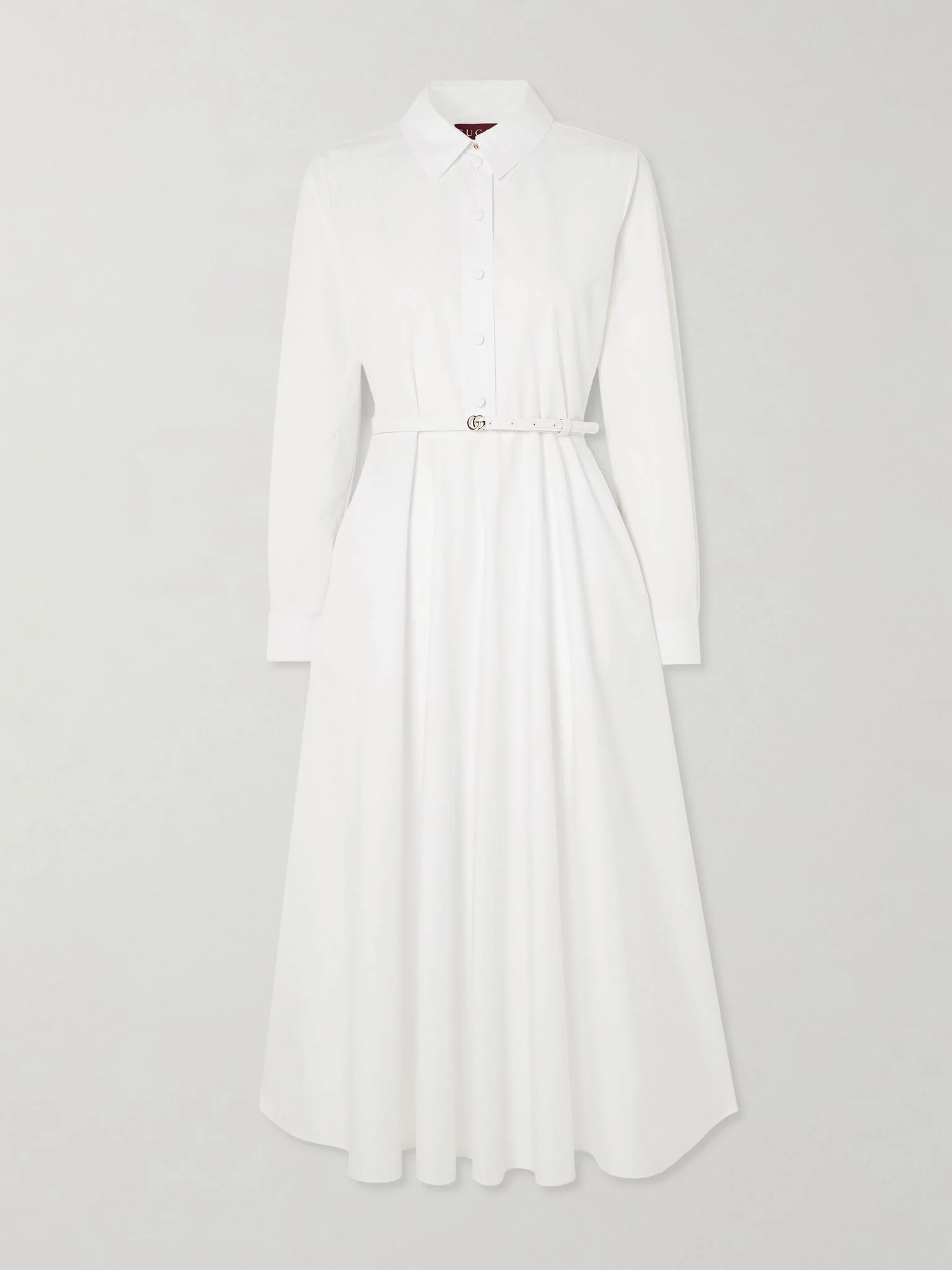 Gucci understands there’s beauty in simplicity. This maxi dress is cut from crisp cotton-poplin and lightly pleated through the skirt. It’s circled by a waist-defining leather belt with the house's signature interlocking monogram and topped with a smart collar subtly embossed with branding. Details & Care - White cotton-poplin and leather - Concealed zip fastening along side - 100% cotton; trim: 100% leather (Cow) - Dry clean