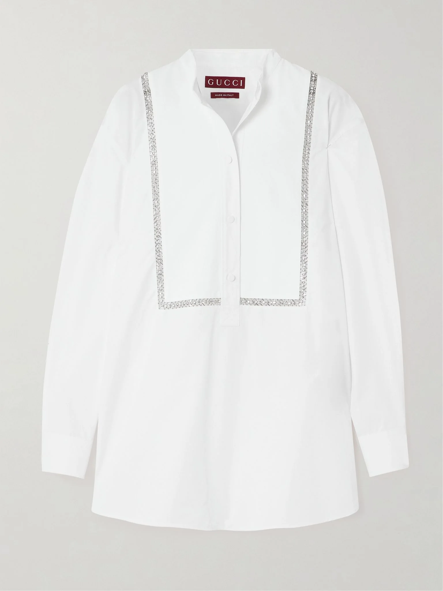 Gucci's take on classic tuxedo-style shirts is imbued with a glamorous touch. Cut from cotton-poplin for an oversized fit, it's framed with a pique bib bordered with gleaming crystals and beads. Wear yours with a satin-trimmed blazer. Details & Care - White cotton-poplin and pique - Button fastenings along front - 100% cotton - Dry clean