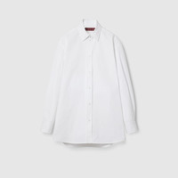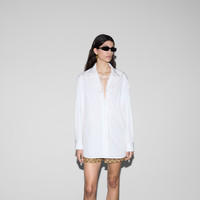 Inspired by the summer spirit and beach clubs on the Italian coast, this item is part of Gucci Lido. The Pre-Fall selections spotlight essential silhouettes with emblematic details from daywear to eveningwear. An oversized shape defines this heavy cotton poplin shirt, revealing an internal ribbon tie that embraces fresh ways to style it. - White heavy cotton poplin - Self-covered buttons - Internal ribbon tie - Point collar - Dropped shoulder - Long sleeves - Shoulder drop: 20.8 " based on a size 42 (IT) - Sleeves length: 33.7 " based on a size 42 (IT) - Neck width: 16.8 " based on a size 42 (IT) - Button closure - Length: 32.8 " based on a size 42 (IT) - Made in Italy - The product shown in this image is a size 42(IT) - Fabric: 100% Cotton