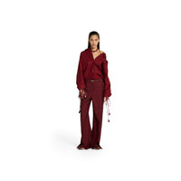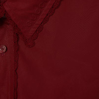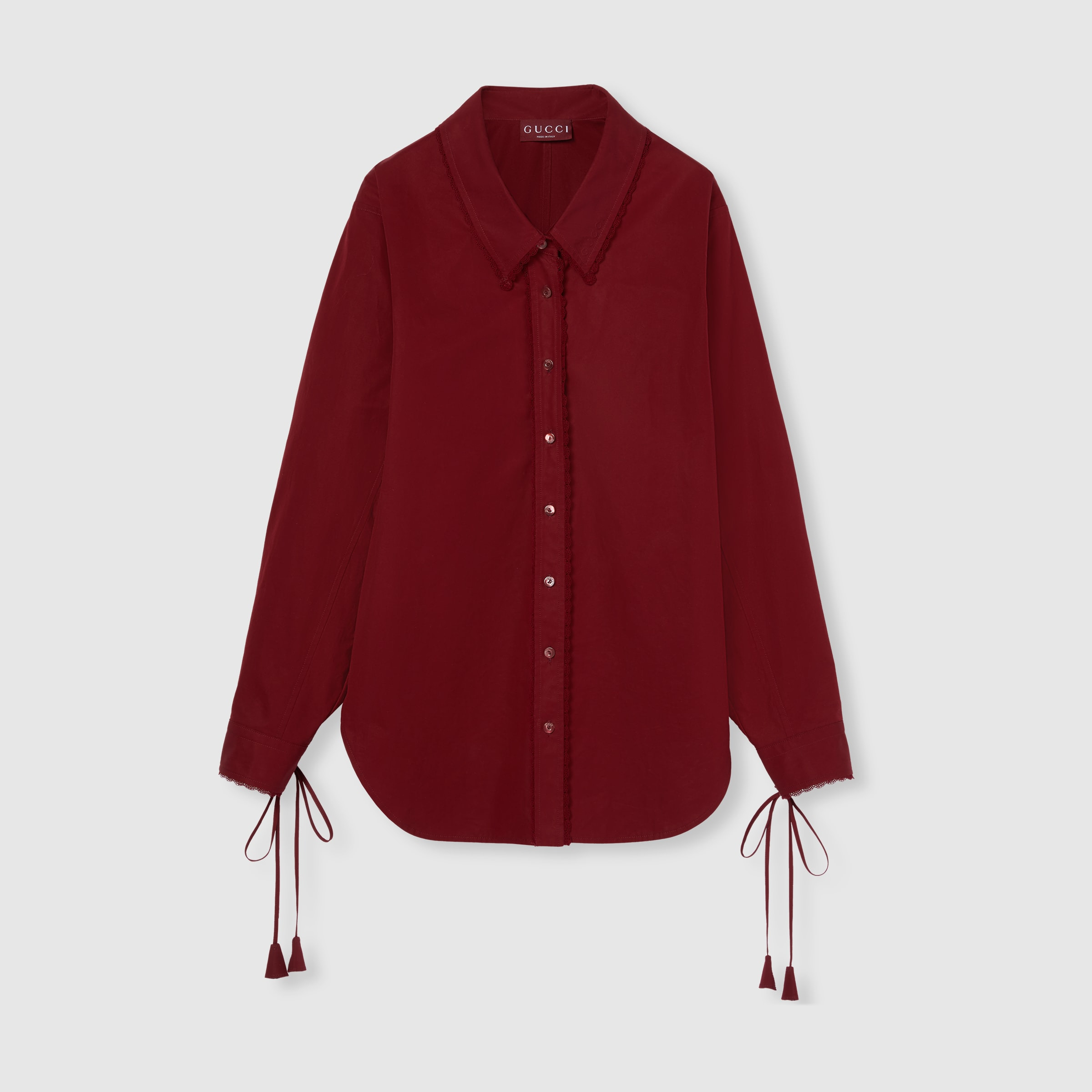 In the Spring Summer 2025 collection, unexpected tailoring is introduced through precise silhouettes. The neckline and cuffs on this shirt can be adjusted for the desired look. - Gucci Rosso Ancora red heavy cotton poplin - Unlined - Point collar - Self-tie neckline - Long sleeves - Detachable wrist ties - Cuff with lace trim - Button closure - Length: 31.1" based on a size 40 (IT) - Made in Italy - The model is 5'8" and is wearing size 40 (IT)