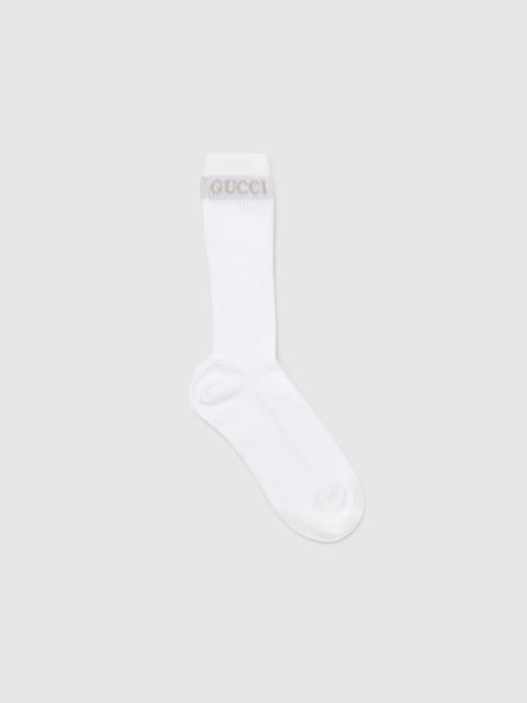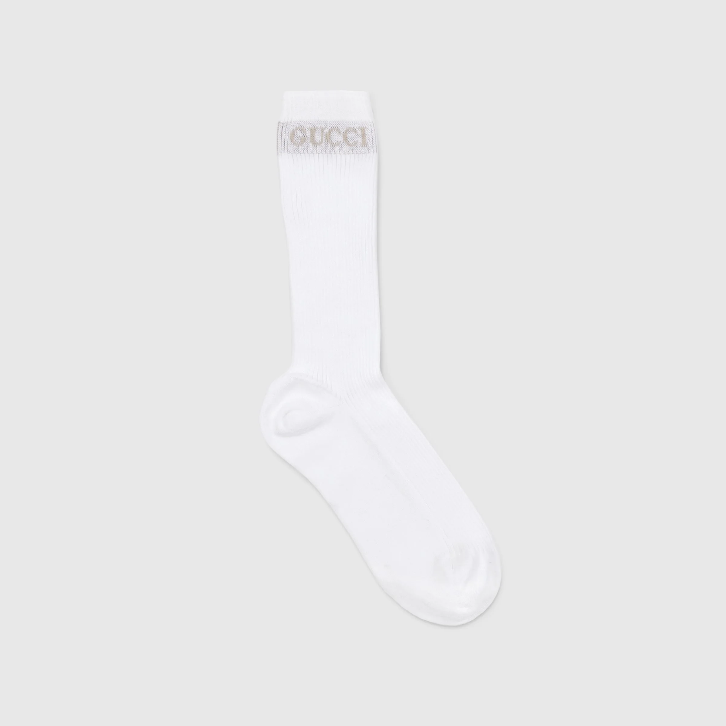 These ribbed cotton socks are presented as part of the Pre-Fall 2025 collection, revealing a contrasting Gucci intarsia logo. - White ribbed cotton - Gucci intarsia - Made in Italy - Please note that intimates, including swimwear, tights, socks and lingerie can only be returned in new condition. Items should be unworn, in their original packaging and with all labels attached