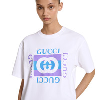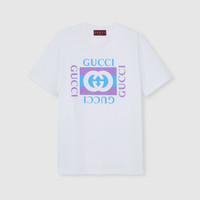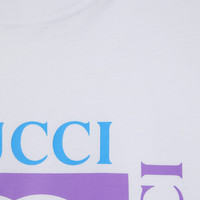 For the Pre-fall 2025 collection, everyday pieces are elevated with prints or embroideries for a casual feel. This T-shirt features a Gucci vintage logo print. - White medium cotton jersey - Gucci vintage logo print - Crewneck - Short sleeves - Made in Italy