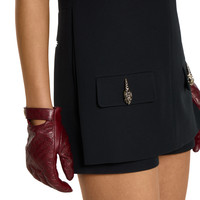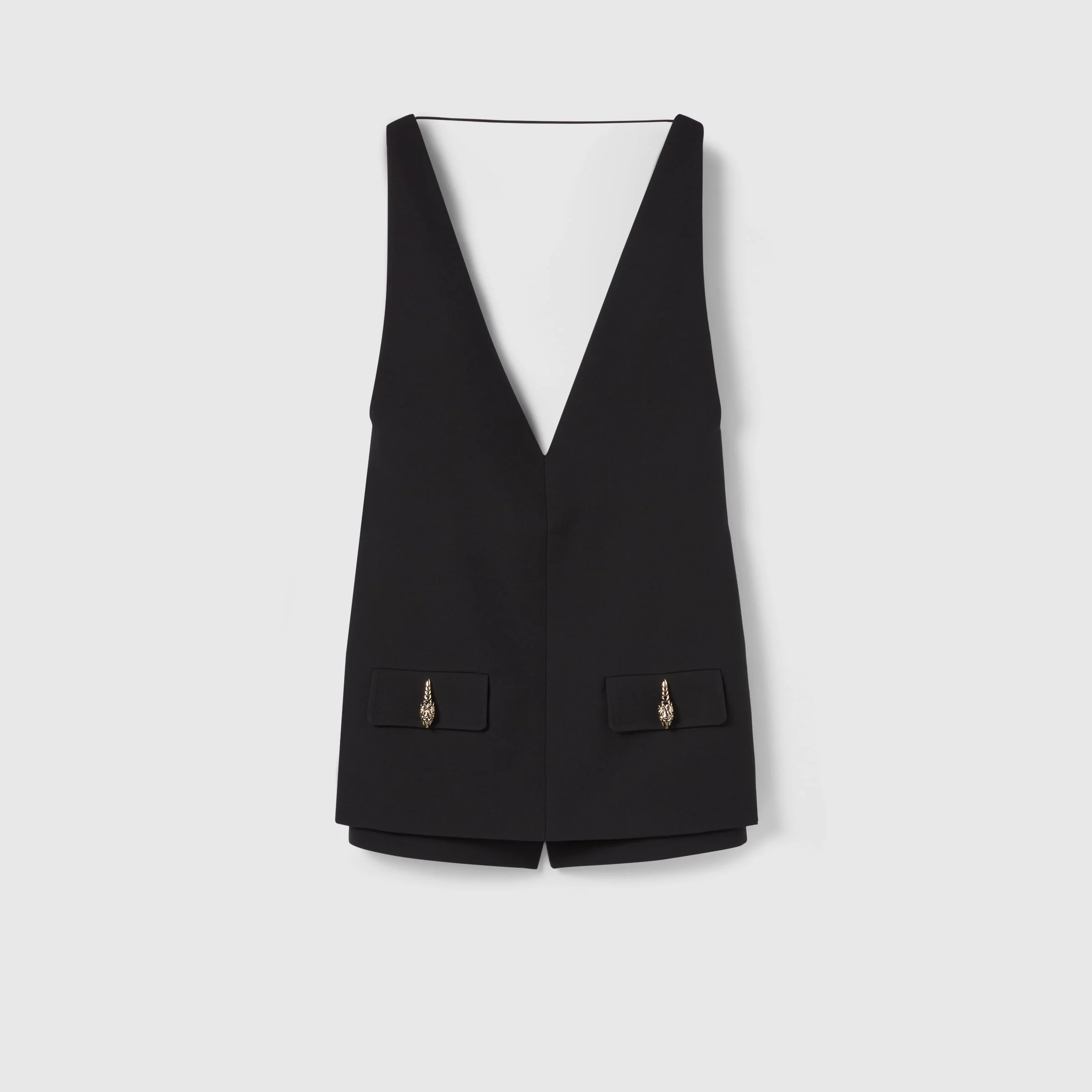 A monochrome palette with subtle details, such as embroideries or logo hardware, transitions the wardrobe from day to night in a selection of pieces from the Pre-Fall 2025 collection. This cady crepe wool silk jumpsuit is enriched with the tiger head detail on the front pockets, a historic symbol of the House. - Black cady crepe wool silk - Tiger head detail - Lined - Plunge V-neck - Sleeveless - Two front pockets - Two back pockets - Zip closure - Made in Italy