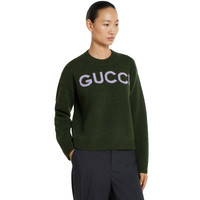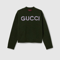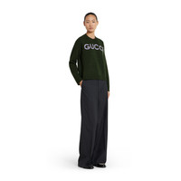 The Gucci logo appears in unexpected colors and fabric combinations, from linen blend to wool. This crewneck top is presented in a green wool and enriched with a 'Gucci' intarsia. - Green wool - Gucci intarsia - Crewneck - Dropped shoulder - Long sleeves - Rib trim - Shoulder drop: 18.5 " based on a size S (IT) - Sleeves Length: 21.2 " based on a size S (IT) - Regular fit - Length: 21.6 " based on a size S (IT) - Made in Italy - Hem Width: 48cm, based on a size S
