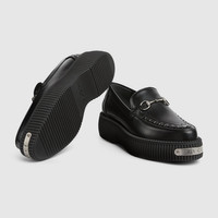 Women's shoes for Fall Winter 2024 reinforce the House logo with subtle design details, from the Horsebit hardware to the Gucci metal plaque. Through its shape and construction, this loafer model in leather draws on classic silhouettes while exuding a contemporary attitude. - Black leather - Women's - Silver-toned hardware - Horsebit - Gucci metal plaque detail - Creeper rubber sole - Flat - Height: 1.7" at the back, 1.3" at the front - Made in Italy