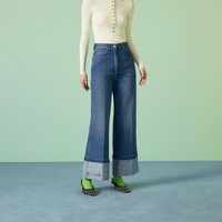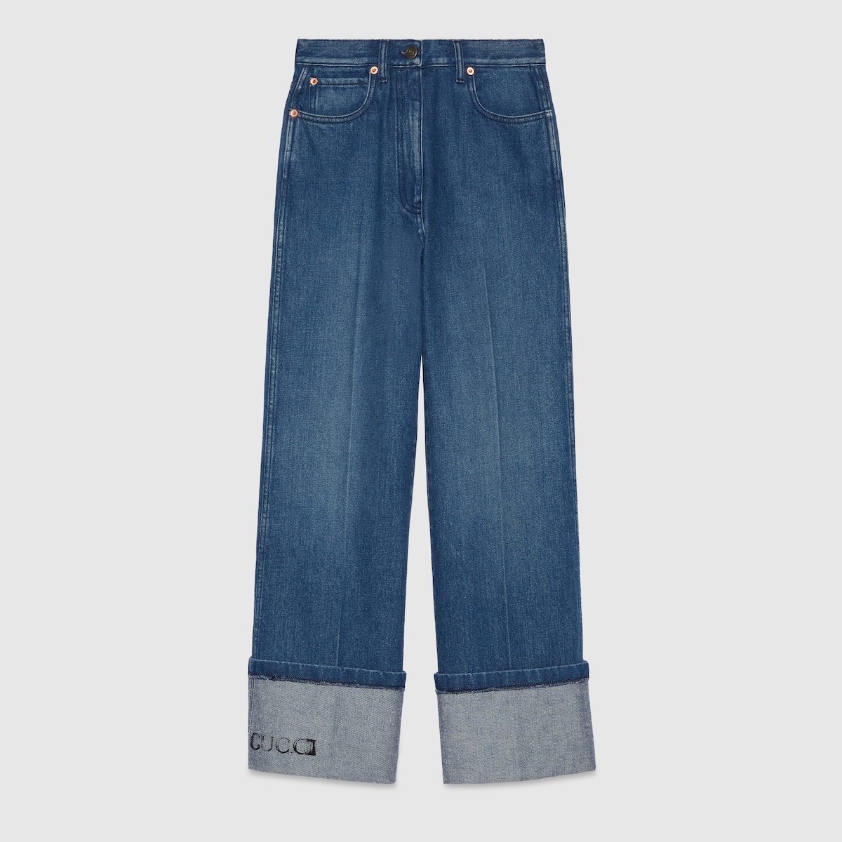 The Pre-Fall 2023 collection captures the essence of Gucci. Crafted from a dark blue washed denim, this contemporary pant reveals a wide silhouette and is enriched with a GUCCI logo stamp effect print on the cuff. - Dark blue washed denim - GUCCI logo stamp effect print - Belt loops - Five-pocket style - Gucci vintage logo leather label - Wide leg with turn-up hem - Button and zip closure - Length: 41.3", based on a size 25 (IT) - Leg width: 11.8", based on a size 25 (IT) - Made in Italy - The product shown in this image is a size 25 (IT)