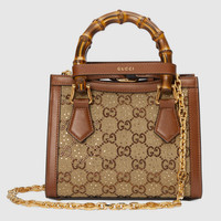 Marking the House’s first in-person fashion show since February 2020, Gucci Love Parade unfolded along Los Angeles' walk of fame. Inspired by the timeless nature of old-Hollywood glamour, the collection presents contemporary takes on traditional pieces. This Gucci Diana mini tote bag is presented in camel and ebony GG canvas with crystal - a refined addition to the emblematic silhouette. - Camel and ebony GG canvas with crystals - Brown leather trim - Shiny antique gold-toned hardware - This item comes with 2 decorative belt handle shapers as shown in the image - Double G - Inside: 1 open card holder - Bamboo handles with 3.1" drop - Detachable and adjustable shoulder strap with 20" drop - Mini size: 7.9"W x 6.3"H x 3.9"D - Weight: 1.4lbs approximately - Made in Italy - Fits up to: iPhone Pro Max/Plus, Airpods, small wallet, and lipstick