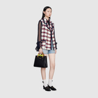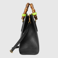 Combining recognizable elements of the House, the small tote bag is defined by its bamboo handles and Double G hardware. Crafted from black leather, the accessory is further accentuated by two neon bands, a playful reference to the bands used to keep handles in shape. - Double G - Black leather - This item comes with 2 decorative neon belt handle shapers as shown in the image - Shiny antique gold-toned hardware - Interior open pocket - Bamboo handles with 2.6" drop - Detachable and adjustable shoulder strap with 21" drop - Weight: .726 kg approximately - Small size: 11"W x 9.5"H x 4.3"D - Made in Italy - The model is 5'8" tall.