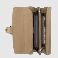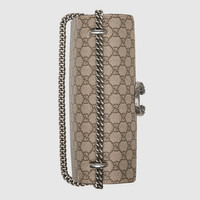 A structured GG Supreme canvas bag with our textured tiger head closure-a unique detail referencing the Greek god Dionysus, who in myth is said to have crossed the river Tigris on a tiger sent to him by Zeus. The sliding chain strap can be worn multiple ways, changing between a shoulder and a top handle bag. - Beige/ebony GG Supreme canvas, with taupe suede detail - Antique silver-toned hardware - Pin closure with side release - Hand-painted edges - Tiger head closure - Interior zipped compartment - Pocket under the flap - Double gussets - Sliding chain strap can be worn as a shoulder strap with 38cm drop or can be worn as a top handle with 22cm drop. - Weight: .6kg approximately - Small size: 11"W x 7"H x 3.5"D - Made in Italy - The model is 5'10" - Fits up to: iPhone Pro Max/Plus, Airpods, long wallet, and lipstick