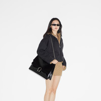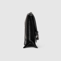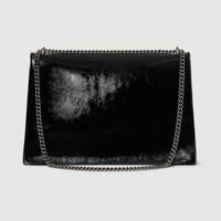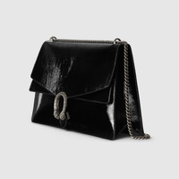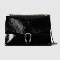 Gucci's Creative Director Sabato de Sarno presents a maxi version of the signature Dionysus shoulder bag. Designed with a more contemporary look, this iteration in sleek black patent leather features a tiger head closure with a flap and a sliding chain that can be adjusted to wear with the preferred length and style. - Black patent leather - Silver-toned hardware - Sliding chain strap can be worn as a shoulder strap with 10.2" drop or can be worn as a top handle with 16.9" drop - Tiger head closure - Weight: 2.8lbs approximately - Large: 16.5"W x 11"H x 4.7"D - Made in Italy - Fits up to: iPhone Pro Max/Plus, Airpods, long wallet, and lipstick