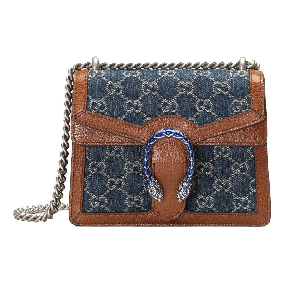 A part of the Epilogue collection, the mini Dionysus is presented with a strong logo feel in GG eco washed organic jacquard. Continuing to frame House codes in new ways, the bag's emblematic tiger head closure is enriched with vibrant blue enamel which complements the denim's dark shade. The style is completed by a contrasting leather trim. - Dark blue and ivory eco washed organic GG jacquard denim - Brown leather - Antique silver-toned hardware with blue enamel - Cotton linen lining - Inserts contain leather made through an alternative metal or chrome free tanning process, reducing the environmental footprint compared to traditional methods. - Tiger head closure - Hand-painted edges - Hand-stitched details - Pocket under the flap - Pin closure with side release - Sliding chain strap can be worn as a shoulder strap with 40cm drop or can be worn as a top handle with 23cm drop - Weight: .45kg approximately - Mini size: 7.5"W x 6"H x 2"D - Made in Italy - The model is 5'5" tall