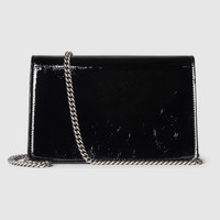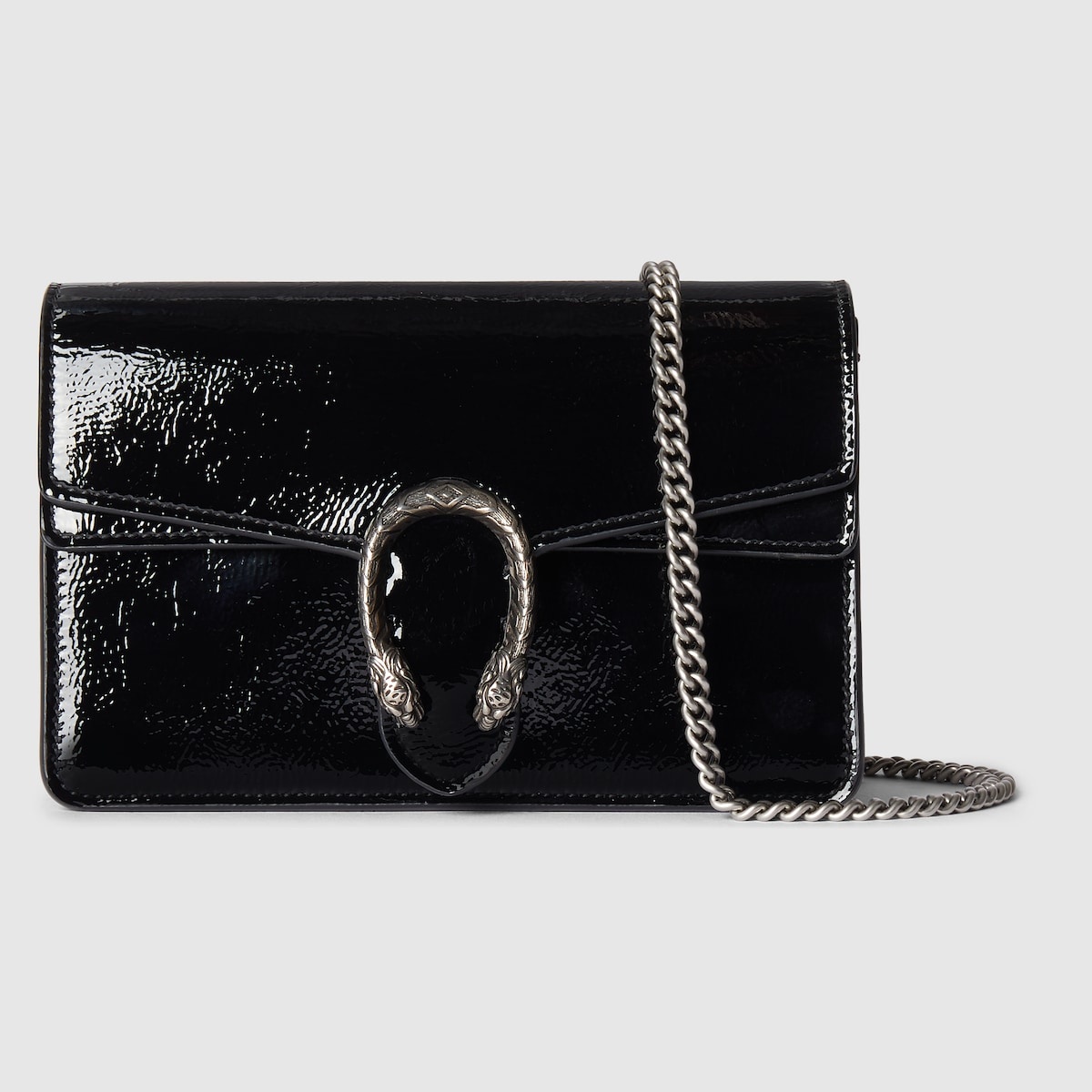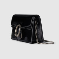 A shiny patent leather brings a fresh take to the Dionysus' well-structured design, while creating contrast with the signature tiger head hardware in a silver tone. A suede leather lining completes the style with an elegant finish. - Black patent leather - Silver-toned hardware - Suede lining - Tiger head - Outside: 1 front flat pocket - Chain shoulder strap with 21" drop; length: 45.7" - Push lock closure - Can be worn over the shoulder or cross-body - Super mini: 6.9"W x 4.3"H x 2.5"D - Weight: 0.77lbs approximately - Made in Italy - Fits up to iPhone Plus, Airpods, card case, and lipstick