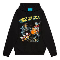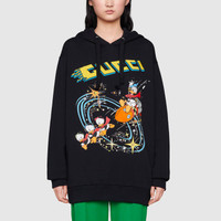 Imbued with a playful spirit, legendary Disney characters continue to enrich the House's narrative. Donald Duck adds a whimsical feel to signature shapes and designs. Here, its image is printed atop a hooded sweatshirt, crafted from washed felted cotton jersey and treated for a vintage, distressed look. - Washed black light felted cotton jersey - Donald Duck print © Disney - This product contains organic cotton where the cultivation and manufacturing process restrict the use of chemicals, eliminate pesticides or artificial fertilizers and incorporate methods that respect biodiversity, improve soil quality, and reduce water consumption. - Fixed hood - Adjustable drawstrings - Oversize fit - Length: 27", based on a size medium - Made in Italy - The product shown in this image is a size small