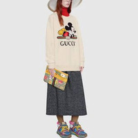 The House's vintage logo is paired with the playful image of Mickey Mouse in this off-white cotton jersey sweatshirt, designed with an oversize fit. In celebration of the Lunar New Year, Disney’s legendary characters appear throughout Gucci’s ready-to-wear and accessories for the Cruise 2020 collection, displayed as colorful prints, embroidered patches or jacquard motifs. - Disney x Gucci ©Disney - Off-white felted organic cotton jersey - Gucci vintage logo with Mickey Mouse print - Crewneck - Oversize fit - Please refer to the size guide to find your preferred fit - Length: 24.8" based on a size small - 100% organic cotton - Made in Italy - The model is 5'9" and is wearing size small