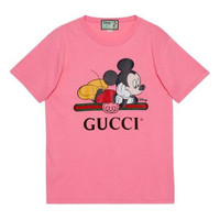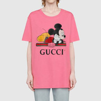 The House's vintage logo is paired with the playful image of Mickey Mouse in this pink cotton jersey T-shirt, designed with an oversize fit. In celebration of the Lunar New Year, Disney’s legendary characters appear throughout Gucci’s ready-to-wear and accessories for the Cruise 2020 collection, displayed as colorful prints, embroidered patches or jacquard motifs. - Disney x Gucci ©Disney - Pink organic cotton jersey - Gucci vintage logo with Mickey Mouse print - Crewneck - Oversize fit - Please refer to the size guide to find your preferred fit - Length: 27.5" based on a size small - 100% organic cotton - Made in Italy - The model is 5'7" and is wearing size small