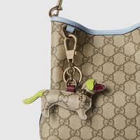 The Pre-Fall 2025 collection introduces accessories that speak to the House's signature themes. This keychain explores a dog-shaped motif in GG Monogram coated fabric, completed with a Round Interlocking G detail. - Beige and dark brown GG Monogram coated fabric - Multicolored leather - Dog shape - Round Interlocking G detail - Hook closure and split ring - 4.3"W x 4"H x 0.4"D - Made in Italy - The bag shown is sold separately and is not included with the charm.