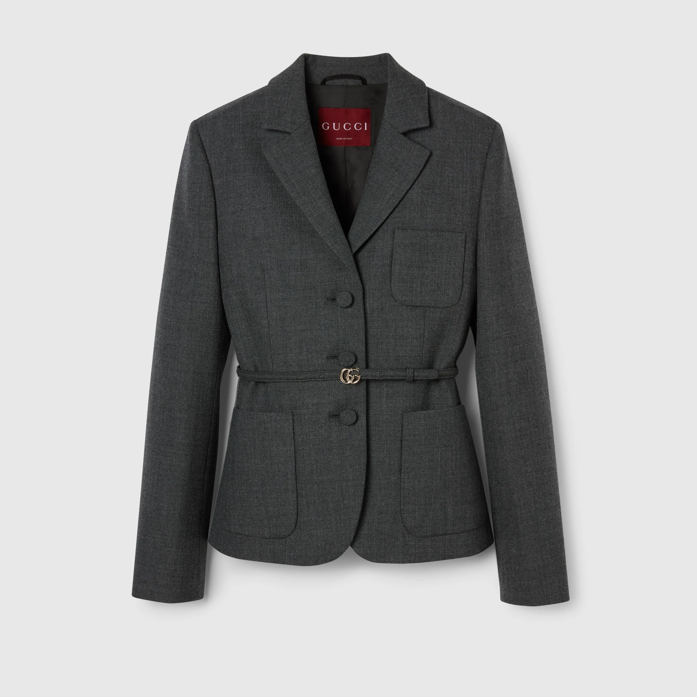 The piece is part of the Pre-Fall 2024 collection presenting a modern take on the essential wardrobe. Made with high-quality wool grisaille, this jacket features a single breasted closure and peak lapels for a timeless look. The detachable waistbelt accentuates the slim fit, and the versatile grey hue is perfect for any occasion. - Grey wool grisaille with subtle diagonal stripes - Lined - Single breast - Peak lapel - One breast patch pocket and two patch pockets - Detachable waistbelt - Shoulder drop: 15.3", based on a size 40 (IT) - Chest: 36", based on a size 40 (IT) - Sleeves length: 32", based on a size 40 (IT) - Cut for a slim fit - Length: 23.6"; based on a size 40 - The product shown in this image is a size 38 (IT)