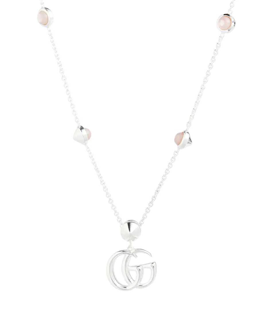 In line with the house's penchant for all things vintage, this Gucci necklace features pink mother-of-pearl stones in a 925 sterling silver setting. The chain itself consists of fine links which are hardly discernible when worn on bare skin. The double G motif – a Gucci Guccio signature – makes for a fitting focal point. Product Details - Material: 925 sterling silver - Made in Italy - Stone I: mother of pearl - Closure: lobster-clasp fastening - Designer color name: 0701/Pink - Item number: P00585701 Size & Fit - Length when open 42cm-16.5" - Pendant length 12mm-0.45" - Pendant width 15mm-0.6"