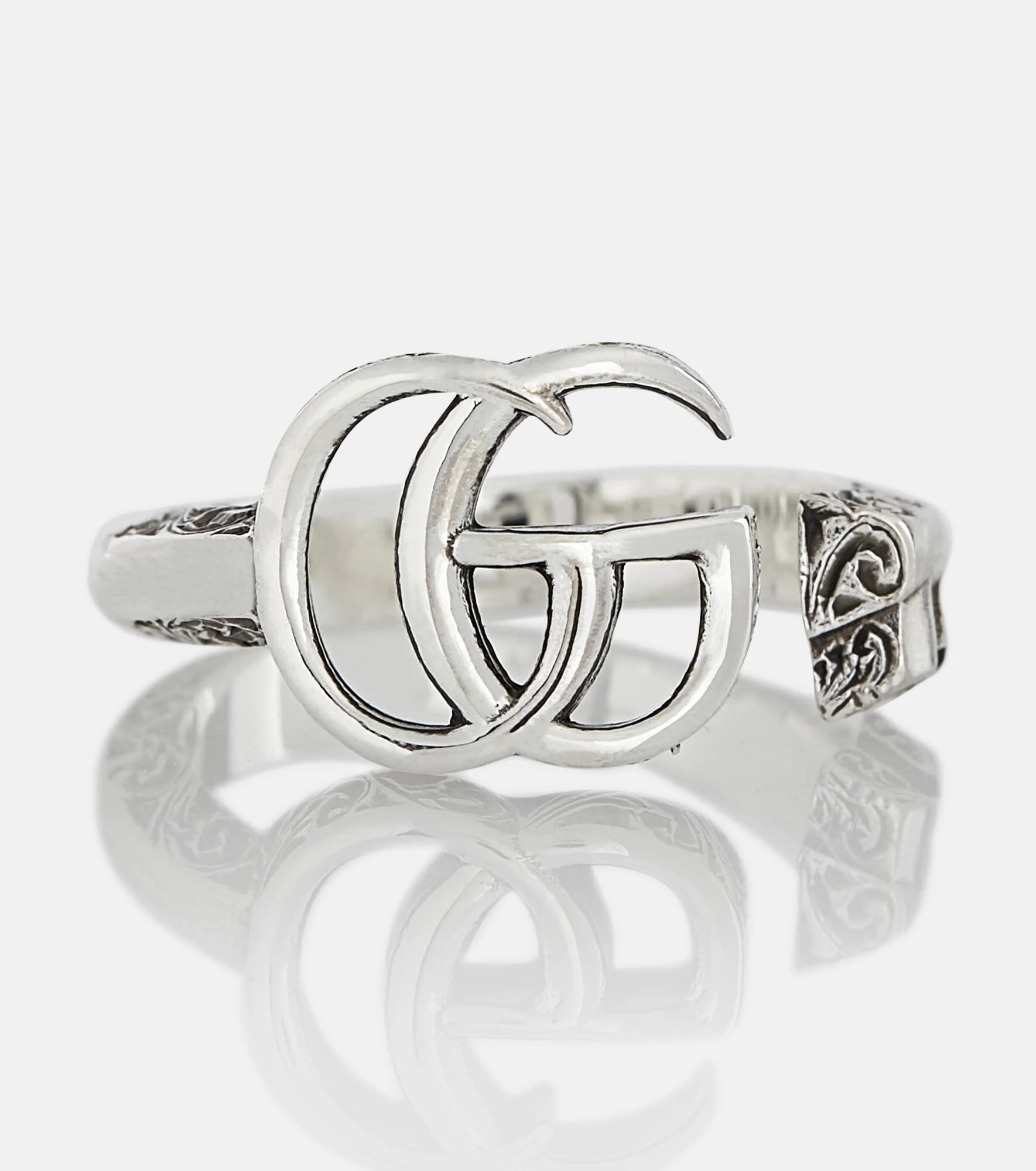 Arabesque engraving ensures this Double G ring from Gucci is unlike anything else you own. A detail previously unseen on any accessories from the house, it lends this sterling silver piece a distinctly on-brand vintage finish. Product Details - Made in Italy - Designer color name: Argentoaurecoblack - Item number: P00585763 Size & Fit - Max. width 11mm-0.45"