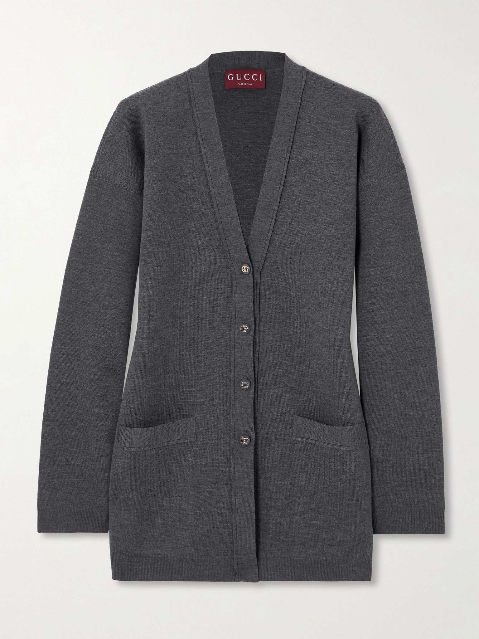 Gucci's cardigan exudes preppy sophistication. It's been made in Italy from warming wool-blend and has a longline silhouette. Button yours over a blouse and pencil skirt. Size & Fit - Fits true to size, take your normal size - Designed for a slim fit - Dropped shoulder seam - Mid-weight knit - Model is 177cm/ 5'10" and is wearing a size Small Model measurements: - Bust: 85cm/ 33.5" - Waist: 65cm/ 25.5" - Hip: 91cm/ 36" Details & Care - Dark-gray wool-blend - Button fastenings through front - 90% wool, 9% polyamide, 1% elastane - Dry clean
