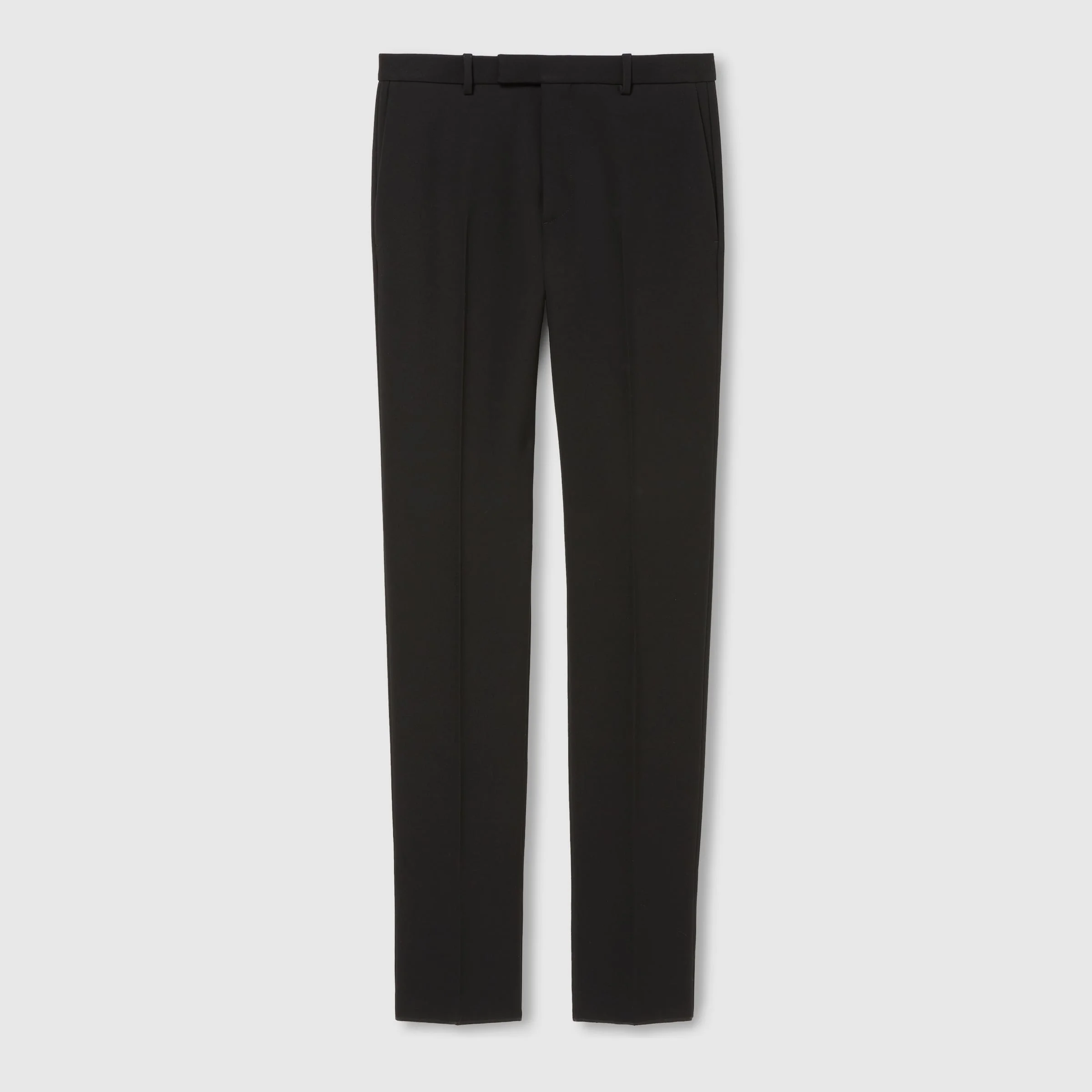 In the Fall Winter 2025 collection, this regular-fit pant is crafted with clean lines and a minimalist construction. Designed with an internal tape belt, the style is unlined to maintain a refined and essential silhouette. - Black dry crepe wool - Gucci horn buttons - Unlined - Internal tape belt - Front slash pockets and back welt pockets - Length: 45.3"; Hem width: 15"; based on a size 46 (IT) - Made in Italy