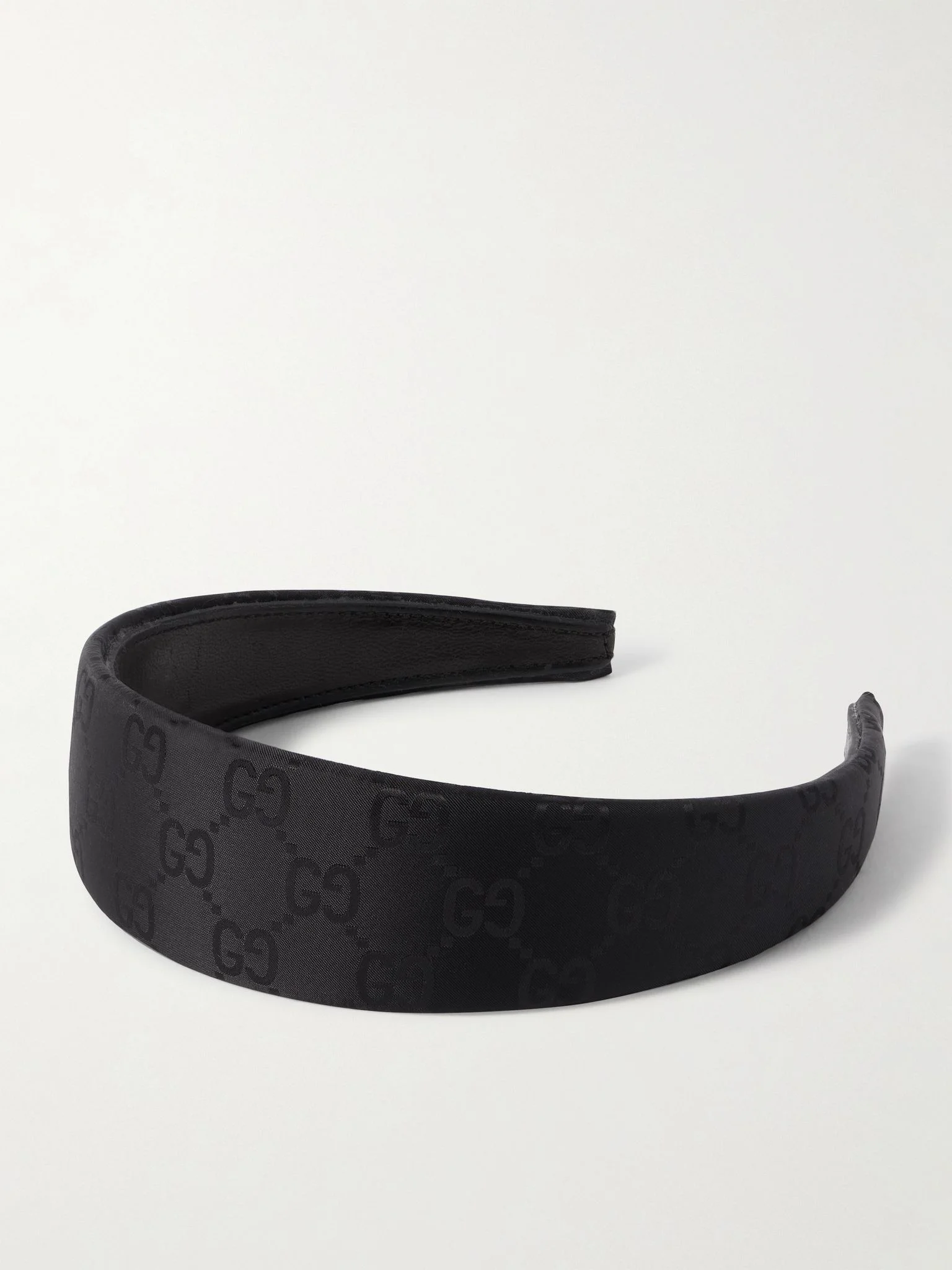 Gucci's nylon headband is chic and understated. Jacquard-woven in Italy with the brand's recognizable 'GG' monogram, it's lined in leather and embellished with a gold-tone plaque at the end. Details & Care - Tonal-black nylon-jacquard