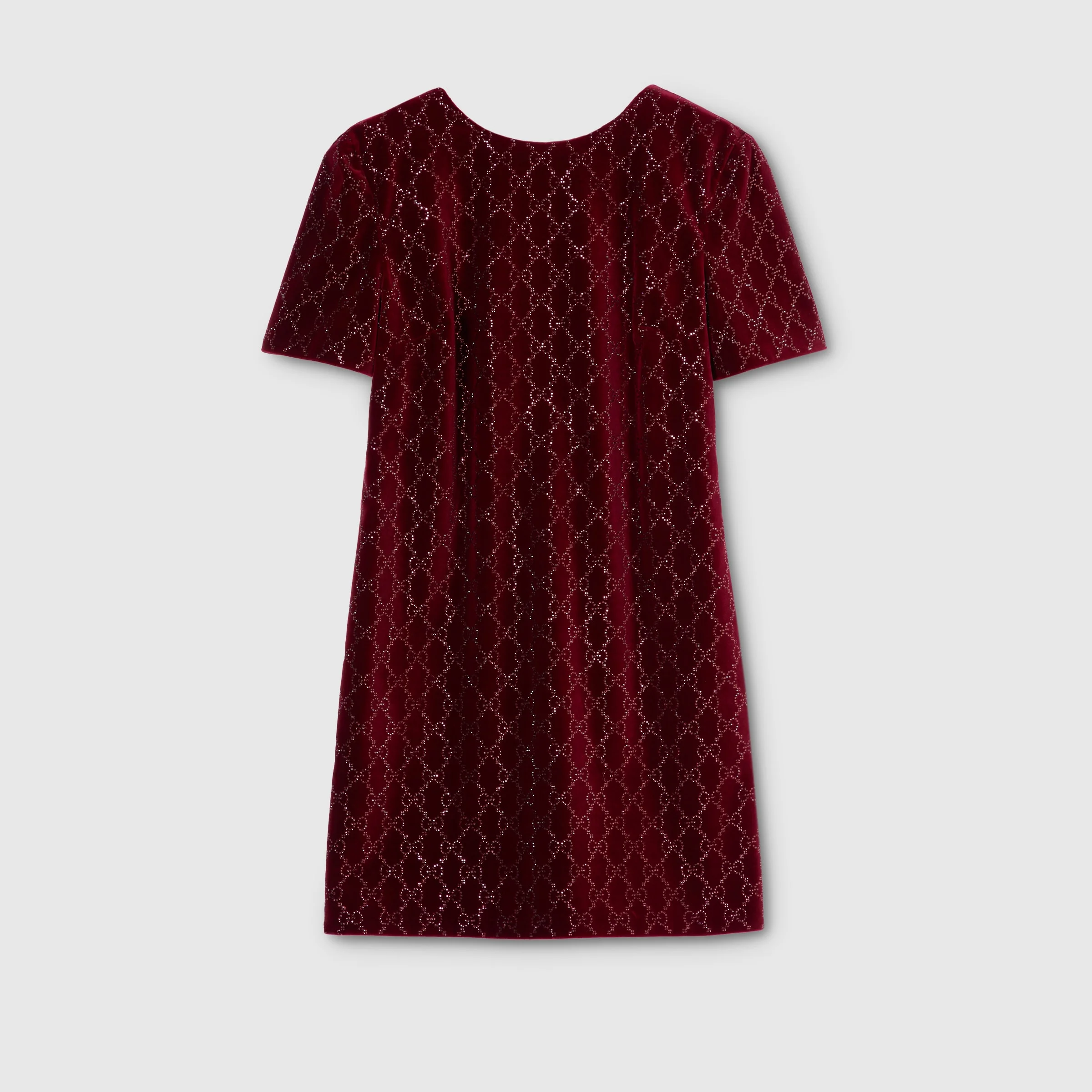 Crystal embellishment is featured in attires that glow from day to night, revisiting signature motifs such as the GG pattern and Horsebit motif. Crafted from stretch cotton velvet, this dress features an allover GG crystal embroidery. - Gucci Rosso Ancora red stretch cotton velvet - Allover GG crystal embroidery - Lined - Short sleeves - Deep V-neck at the back - Length: 32.2" based on a size 40 (IT)