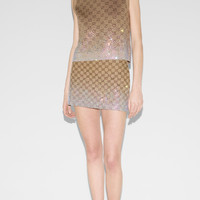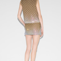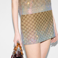 A selection of ready to wear pieces are decorated with shimmering and sparkling details, adding an unexpected twist to signature House styles. This mini skirt is presented in GG canvas and reveals a gradient-effect crystal applique at the hem. - Camel and brown GG canvas - Gradient-effect crystal applique at the hem - Lined - Two side pockets - Hidden zip closure - Mini - Made in Italy - The product shown in this image is a size 38 (IT)