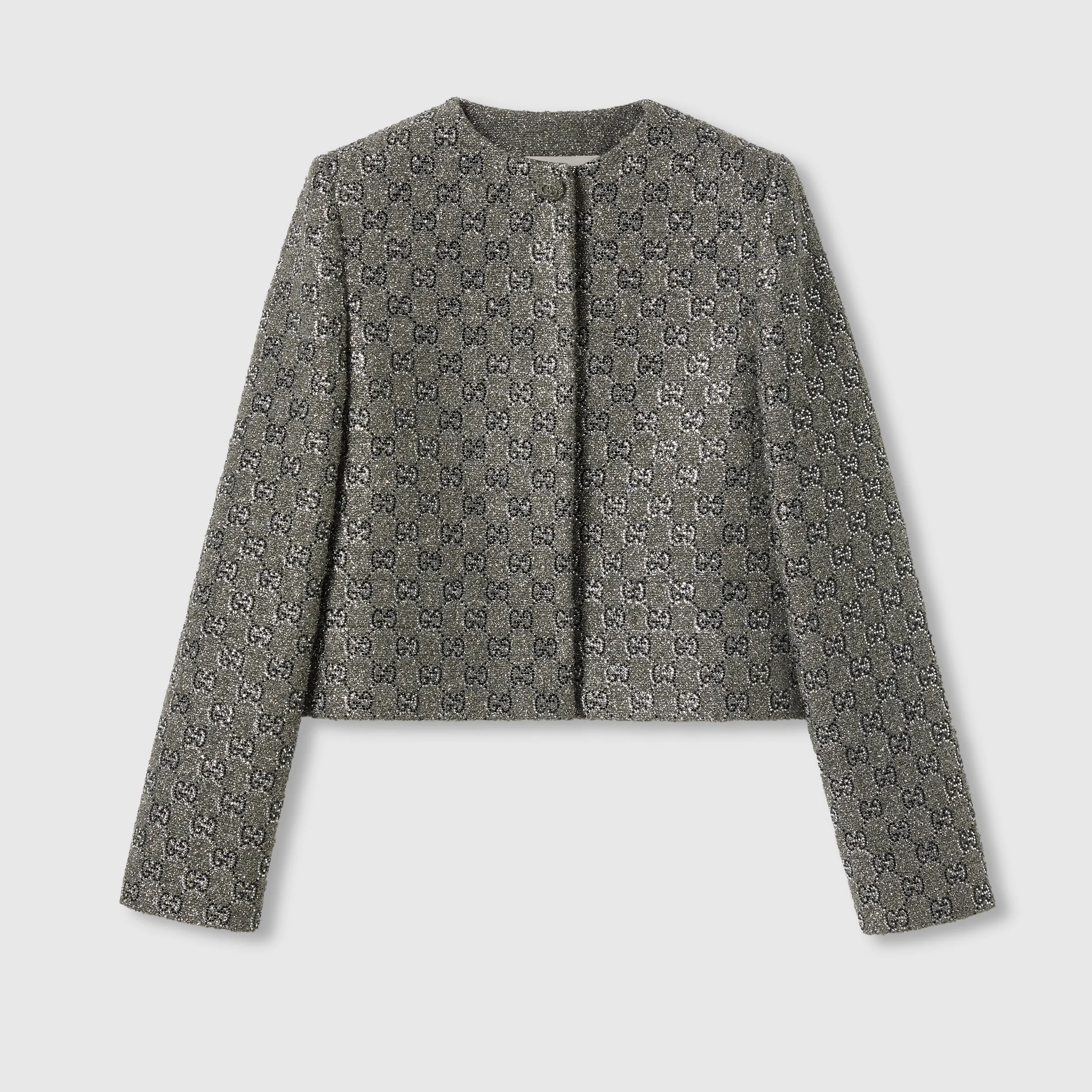 Taking inspiration from founder Guccio Gucci's monogram, the GG motif continues to be a firm favorite of the House. This minimal jacket has been cut from a GG light wool tweed with optical effect and embellished with an allover GG crystal embroidery. - Grey light wool tweed with optical effect - Double G button - Self-covered buttons - Allover GG crystal embroidery - Lined - Collarless - Two front pockets - Button closure - Length: 19.2"; based on a size 38 (IT) - Made in Italy - The model is 5'9" and is wearing size 38 (IT)