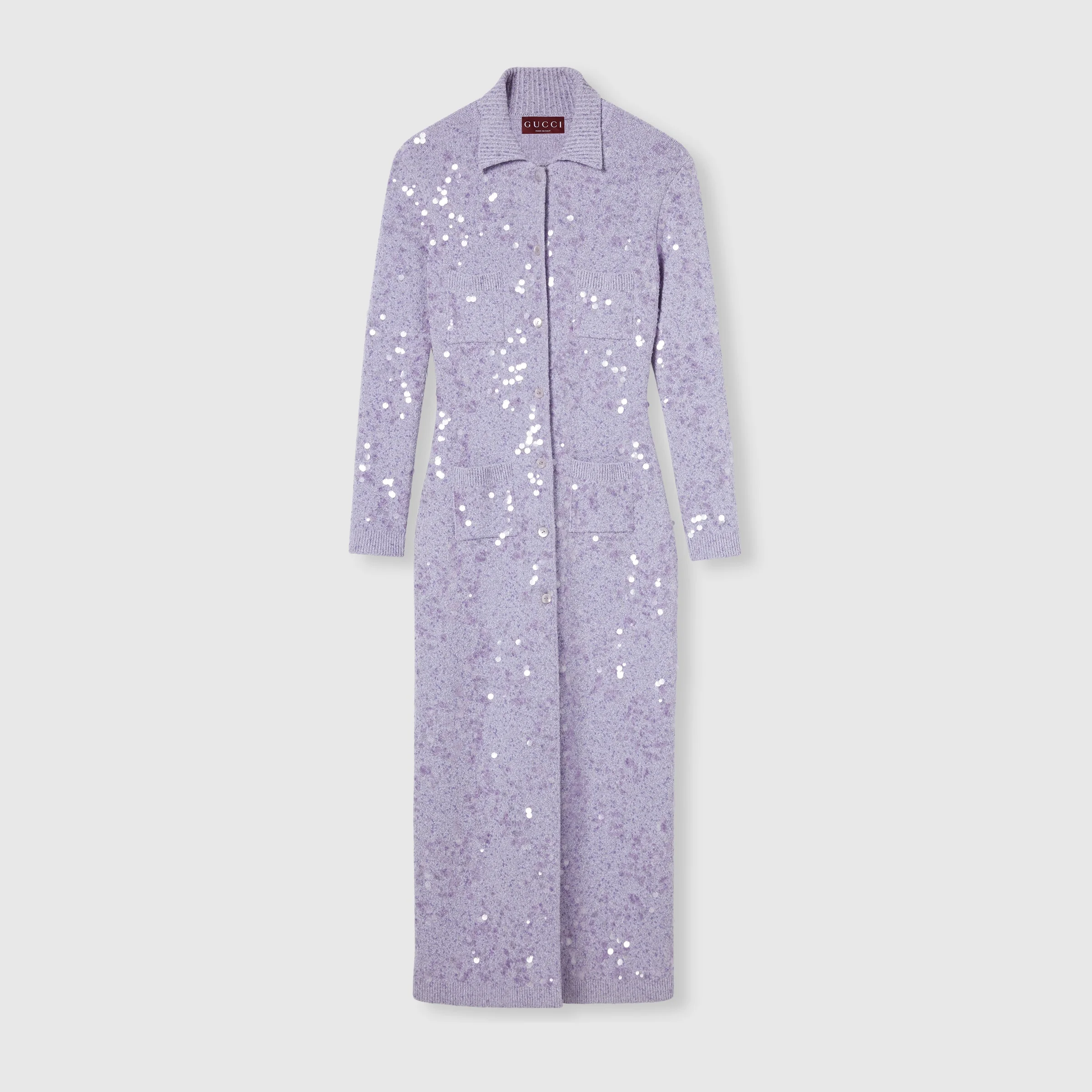 For the Pre-fall 2025 collection, colorful skirts and dresses infuse ready-to-wear with a vibrant twist for the transitional wardrobe. This viscose jersey skirt appears in a delicate hue and is complete with the Gucci embroidery. This fine viscose dress in a delicate hue is enriched with an allover sequin embroidery. - Lilac fine viscose - Allover sequin embroidery - Polo collar - Long sleeves - Two chest pockets - Two front pockets - Rib trim - Button closure - Length: 52.7"; based on a size S - Made in Italy