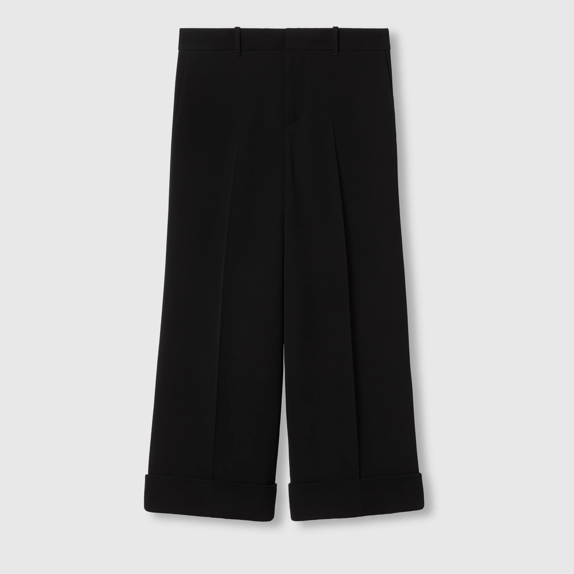 The Gucci Cruise 2025 collection features minimalist garments in either total white or total black, introducing finely constructed pieces in an essential palette. These pants are presented in a heavy viscose sable and completed with a Gucci embroidery and turn-up cuffs. - Black heavy viscose sable - Gucci embroidery - Unlined - Belt loops - Two side pockets - Two back pockets - Turn-up cuffs - Hook and zip fly closure - Culotte - Length: 35.4"; based on a size 38 (IT) - Made in Italy - The product shown in this image is a size 38 (IT)