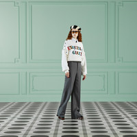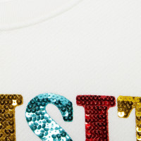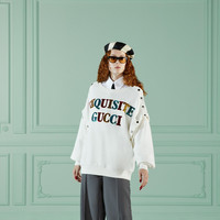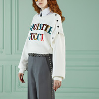This white cotton jersey sweatshirt is enriched with distinctive logo details. On the front the name of the collection 'Exquisite Gucci' appears in playful multicolored sequins, reflecting the joyful narrative of the runway show. Metal buttons complete the silhouette. - White heavy felted cotton jersey - Rib trims - 'Exquisite Gucci' print with sequin embroidery - Metal buttons on the sleeves - Crewneck - Long sleeves - Made in Italy - The product shown in this image is a size small