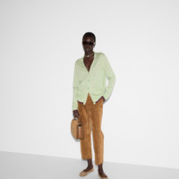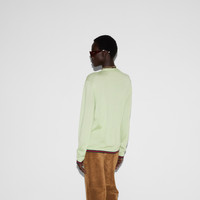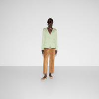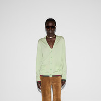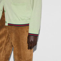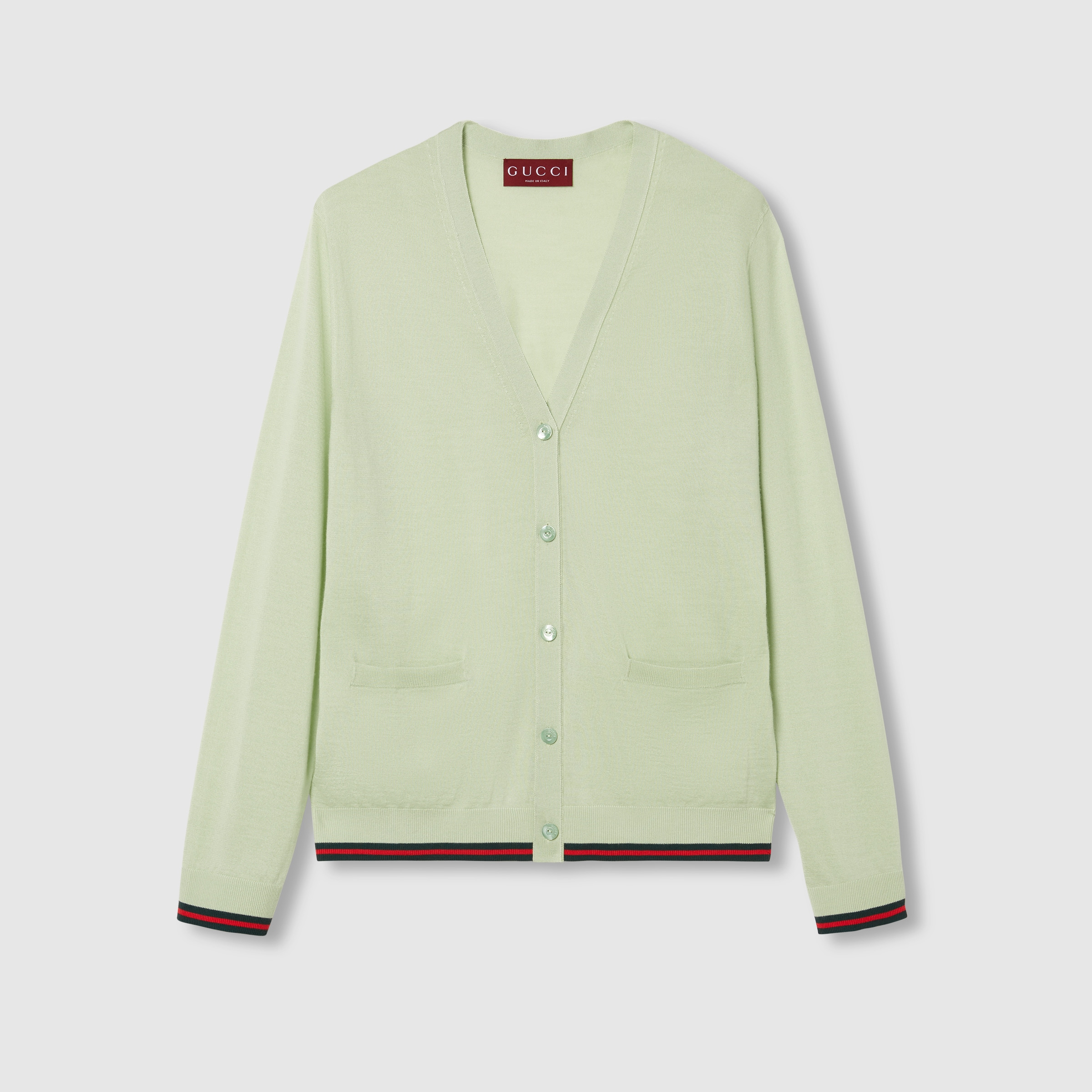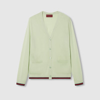 This elegant cardigan appears as part of the Cruise 2025 collection in an extra fine cashmere silk plain knit. A pale green shade adds to the refined feel of the garment, further defined by a green and red Web trim. - Pale green extra fine cashmere silk plain knit - V-neck - Dropped shoulder - Long sleeves - Two front pockets - Web trim - Button closure - Length: 25.2"; Shoulder: 16.1"; Half waist/chest: 19.7"; Sleeves length: 24" based on a size S - Made in Italy - The product shown in this image is a size small