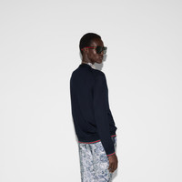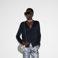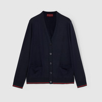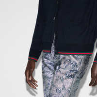 This elegant cardigan appears as part of the Cruise 2025 collection in an extrafine cashmere silk plain knit. A navy shade adds to the refined feel of the garment, further defined by a green and red Web trim. - Navy extra fine cashmere silk plain knit - V-neck - Dropped shoulder - Long sleeves - Two front pockets - Web trim - Button closure - Length: 25.2"; Shoulder: 16.1"; Half waist/chest: 19.7"; Sleeves length: 24" based on a size S - Made in Italy - The product shown in this image is a size small