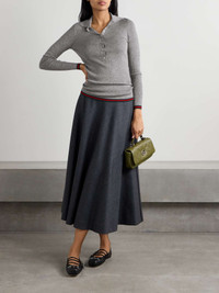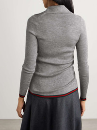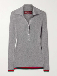 EDITORS'NOTES Gucci's take on the classic polo shirt features the label's moniker knitted discreetly along the button-fastening placket, as well as green and red webbing stripes along the cuffs and hem. It's been made in Italy from luxurious cashmere and silk-blend and is ribbed to emphasize the close fit. SIZE & FIT - Fits true to size, take your normal size - Designed for a close fit - Lightweight knit - Model is wearing a size Small DETAILS & CARE - Gray, dark-green and red cashmere and silk-blend - Button fastenings along front - 70% cashmere, 30% silk - Dry clean - Mother-of-pearl: Indonesia