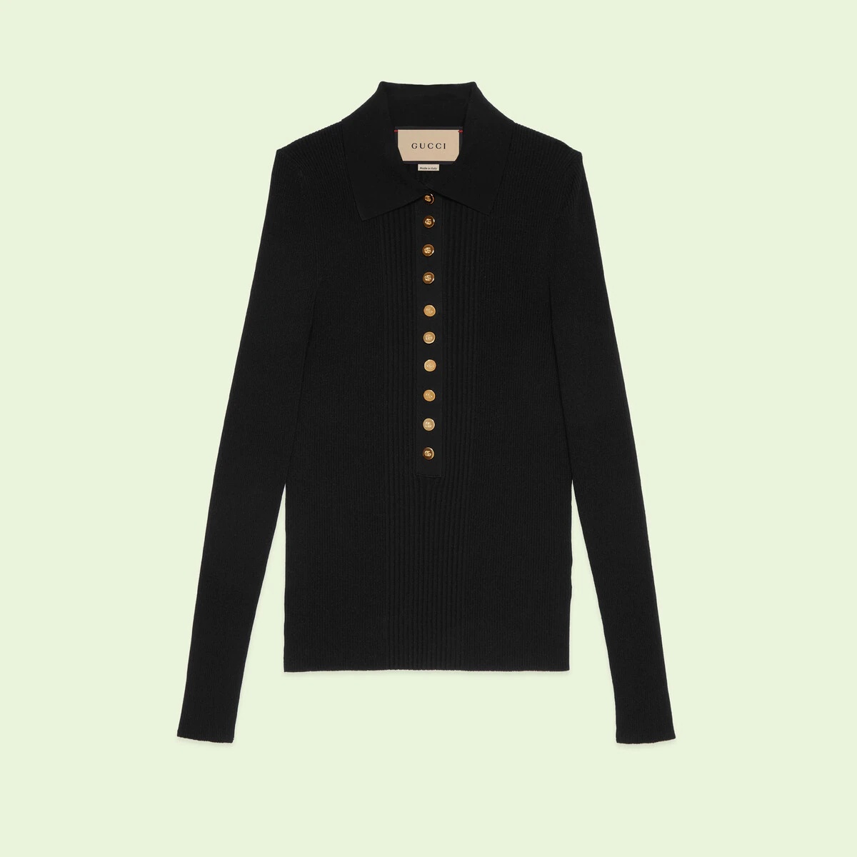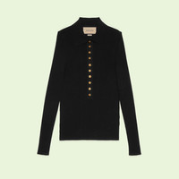 Gucci Love Parade explores a variety of possibilities, translating the concept onto fabrics and silhouettes to present new purposes and ways of dressing. This long-sleeved polo knit is crafted from extra fine viscose. - Black extra fine viscose - Polo collar - Long sleeves - Sleeve Length: 23,2" - Button closure - Length: 21,2" based on a size 2xS - Made in Italy - The model is 5'7" tall. The product shown in this image is a size extra extra small - Hem Width: 8,66"