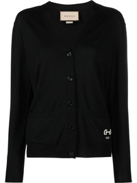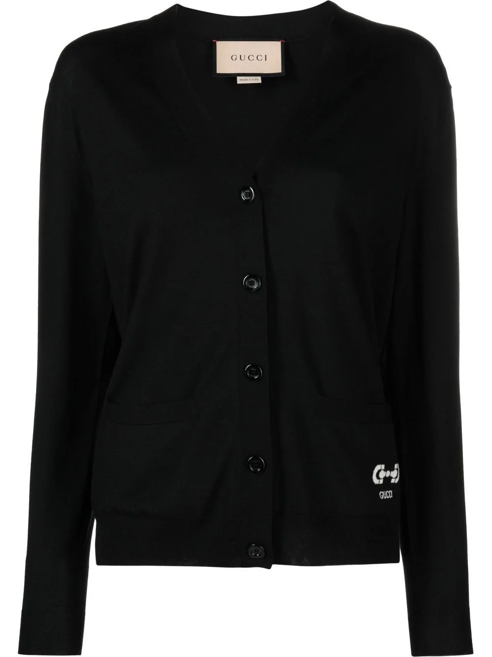 wool button-up cardigan black wool fine knit logo print at the hem V-neck front button fastening long sleeves Made in Italy Composition Wool 100% SIZE & FIT Measurement BUST 43.3 in(110 cm) LENGTH 37.79 in(96 cm) WAIST 25.98 in(66 cm) SLEEVE LENGTH 18.89 in(48 cm)