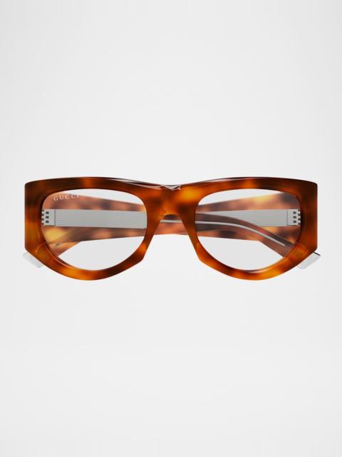 - Gucci "GG1918S" oval sunglasses in GG monogram acetate - Eye/bridge/temple (in mm): 53-21-140 - GG monogram lenses; right logo script - Saddle nose bridge - Wide, tapered arms - 100% UVA/UVB protection - Made in Italy - Proposition 65 warning for California residents