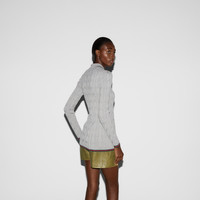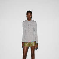 Introducing new knitwear styles, sophisticated yarn provides volume, and is further elevated through artisanal details which highlight rich textures. With a new focus on yarns, these knits can be worn alone as a standout piece, or layered to complement the Fall Winter 2024 wardrobe. This fine cable and rib wool polo top is defined by a Web trim. - Grey fine cable and rib wool - Gucci intarsia - Polo collar - Long sleeves - Web trim - Button closure - Length: 25.9"; based on a size S - The product shown in this image is a size small