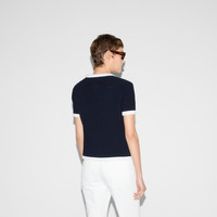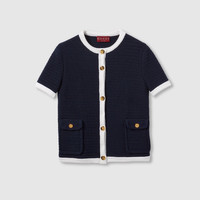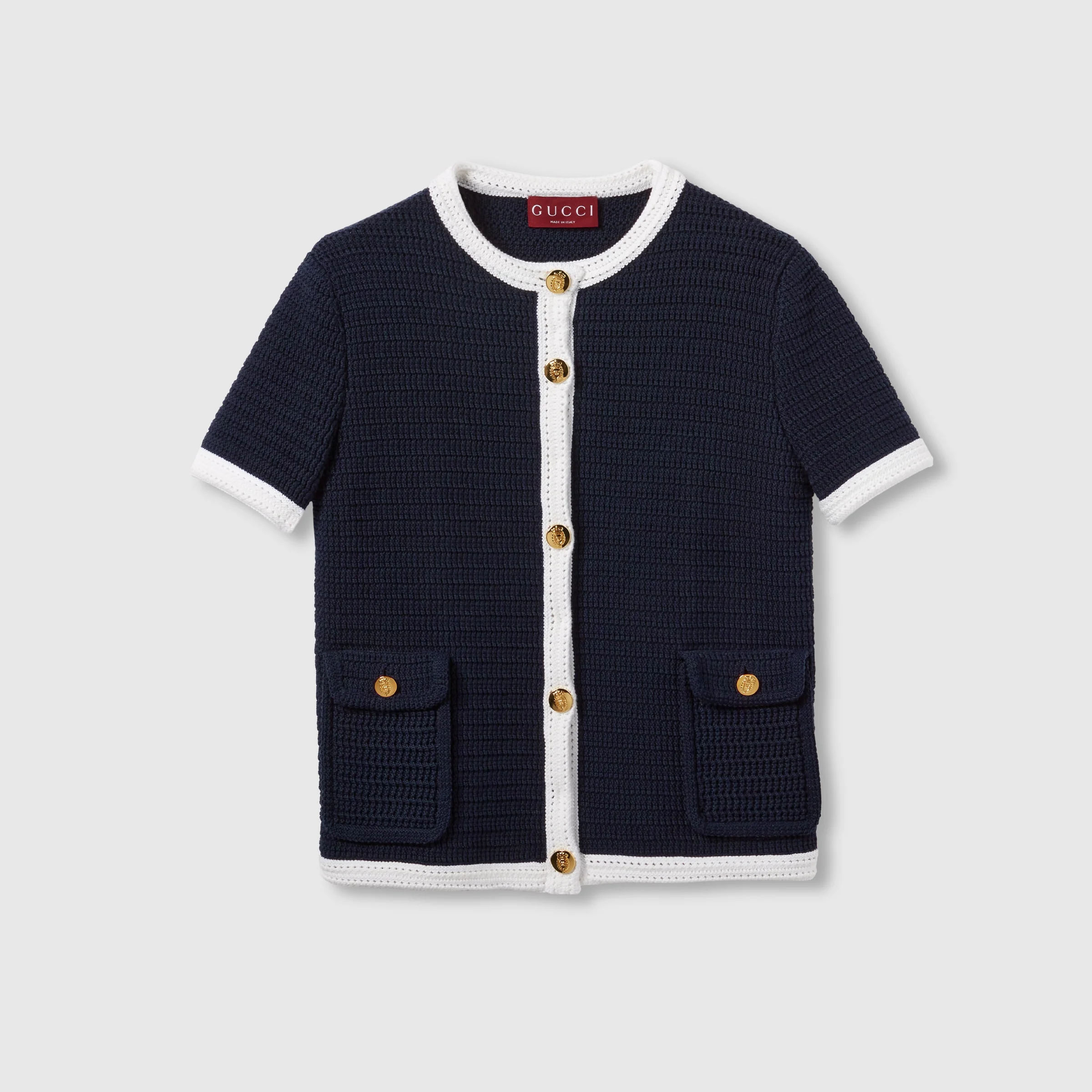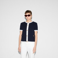 This crewneck cardigan appears as part of the Cruise 2025 collection in a fine cotton. A navy shade adds to the refined feel of the garment, further enriched with gold-toned crest buttons. - Navy fine cotton - White fine cotton trim - Gold-toned metal crest buttons - Crewneck - Short sleeves - Two front pockets - Rib trim - Button closure - Length: 21.3"; Shoulder: 14.6"; Half waist/chest: 18.5"; Sleeves length: 7.9" based on a size s - Made in Italy - The model is 5'7" and is wearing size small