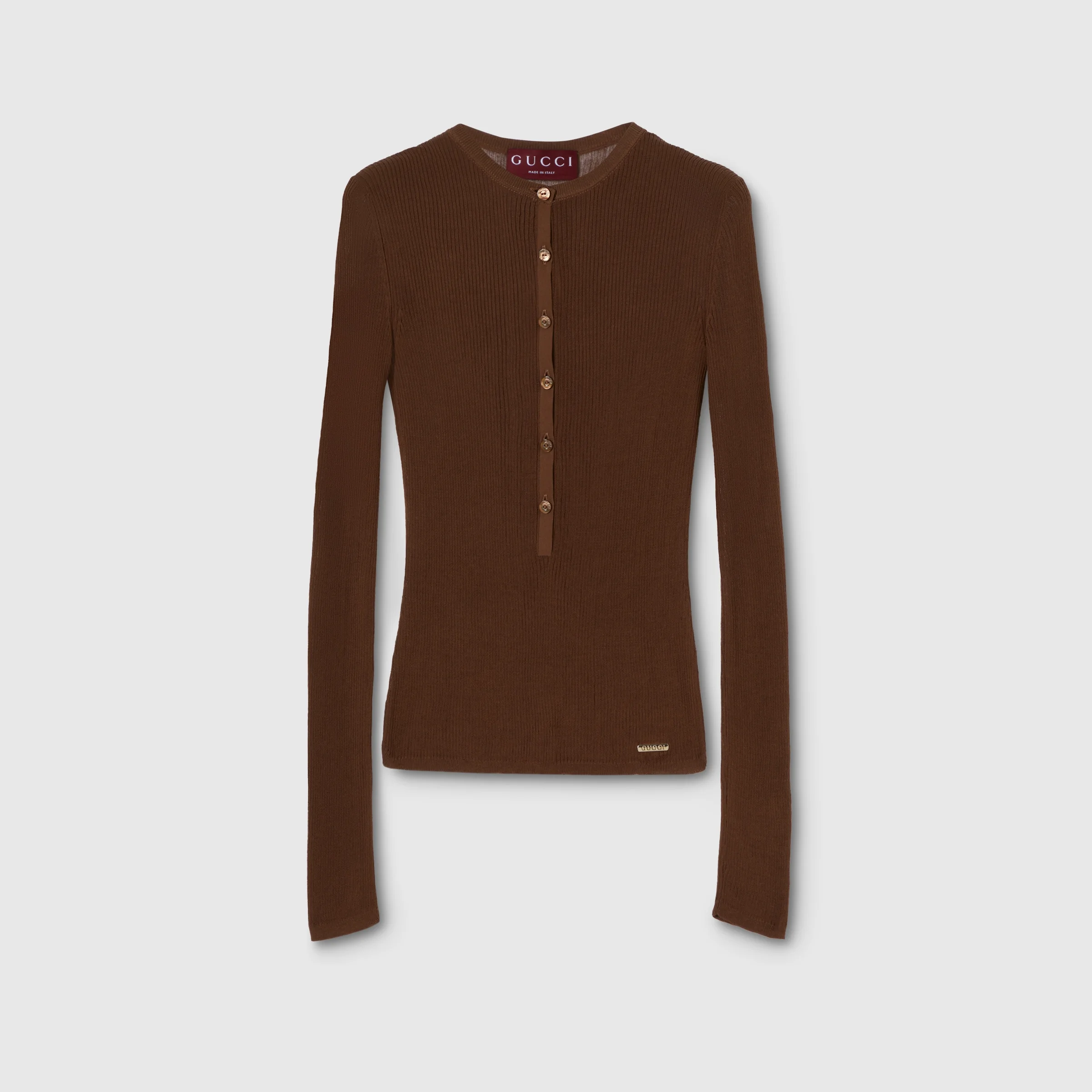The Cruise 2026 women's ready-to-wear collection celebrates the Gucci wardrobe, blending archival influence with the history of Florence in a playful melange, ranging from the minimal to the maximal. Crafted from light brown extra fine cotton rib, this cardigan is completed with a Gucci detail on the back. - Light brown extra fine cotton rib - Gucci detail on the back - Crewneck - Long sleeves - Front button closure - Length: 22.4" based on a size S