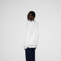 This V-neck cardigan appears as part of the Cruise 2025 collection in a fine wool knit. A white shade adds to the refined feel of the garment, further enriched with Round Interlocking G buttons. - White fine wool - Dark blue piping trim - Round Interlocking G buttons - V-neck - Dropped shoulder - Long sleeves - Two front pockets - Rib trim - Button closure - Length: 28"; Shoulder: 18.1"; Half waist/chest: 20.5"; Sleeves length: 23.2" based on a size s - Made in Italy - The product shown in this image is a size small