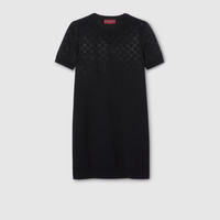 The Cruise 2026 women's ready-to-wear collection highlights sumptuous materials on essential silhouettes to usher in the festive season. Crafted from black fine wool, this dress is enriched with gradient GG crystals. - Black fine wool - Gradient GG crystals - Crewneck - Short sleeves - Rib trim - Length: 31.1", based on a size S