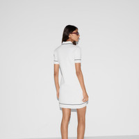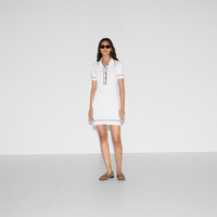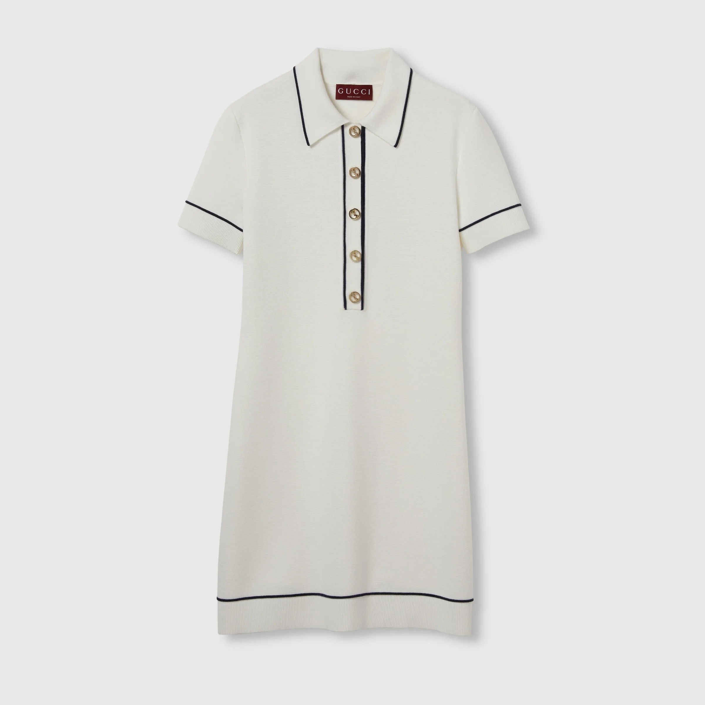 This polo dress appears as part of the Cruise 2025 collection in a fine wool knit. A dark blue trim adds to the refined feel of the garment, further enriched with Round Interlocking G buttons. - White fine wool - Dark blue piping trim - Round Interlocking G buttons - Polo collar - Dropped shoulder - Short sleeves - Rib trim - Button closure - Length: 33.5"; Shoulder: 14.2"; Half waist/chest: 17.3"; Sleeves length: 8.5" based on a size xs - Made in Italy - The product shown in this image is a size extra small