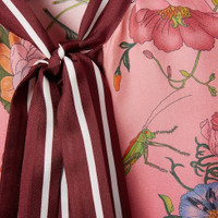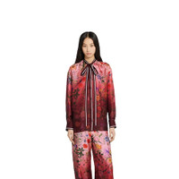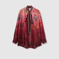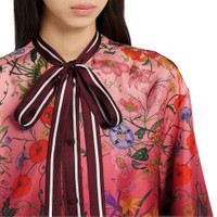 The archival Flora print from the 1960s comes to life on ready-to-wear, exploring fresh hues and gradients for Pre-Fall 2025 with a romantic touch. The print appears atop this silk twill shirt with a self-tie neck bow, growing in density towards the hem. - Pink and Gucci Rosso Ancora red silk twill - Allover gradient Gucci Flora print - Self-covered buttons - Unlined - Self-tie neck bow - High low hem - Button closure - Made in Italy
